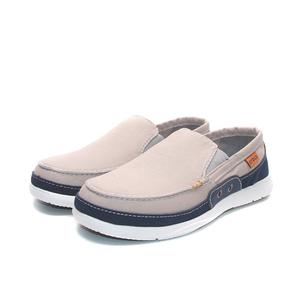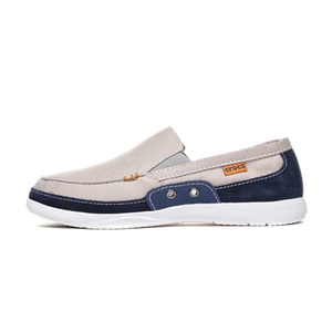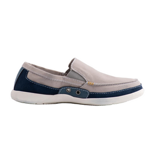 حذاء كروكس والو أكسنت الرجالي سهل الارتداء، بجزء علوي من القماش، بلونين رمادي فاتح وأزرق داكن. مزود ببطانة داخلية قابلة للإزالة من الألياف الدقيقة لمزيد من الراحة، وفتحات جانبية للتهوية. يُعد هذا الحذاء جزءًا من مجموعة كروكس الواسعة من الأحذية الكاجوال والمريحة.