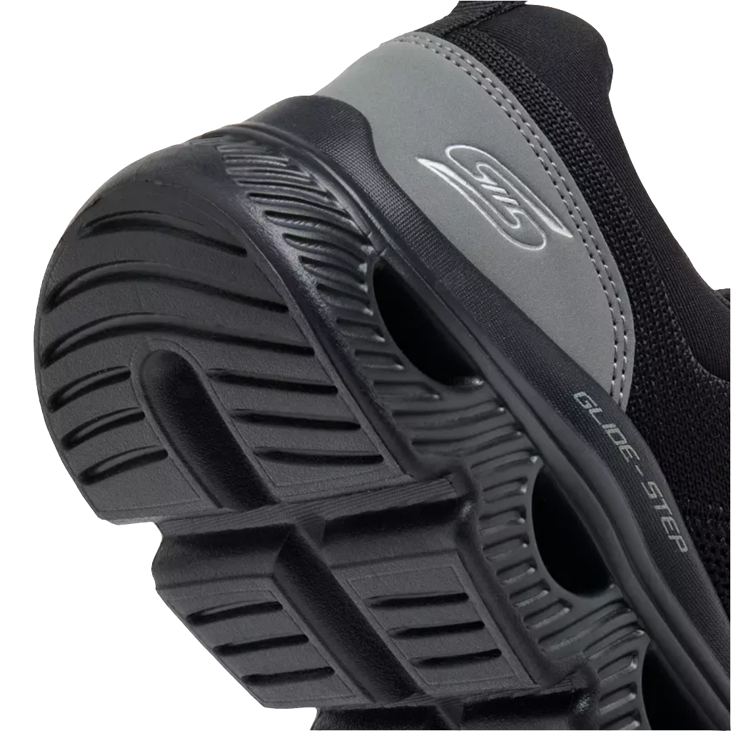 حذاء سكيتشرز غلايد ستيب هي مجموعة أحذية بنعل أوسط هندسي فريد مصمم لتوفير ثبات طبيعي مع كل خطوة. تشتهر هذه الأحذية بنعلها الخارجي المرن الذي يتحرك مع مرتديها، مما يجعلها مناسبة للمشي والتمارين الرياضية. تتميز العديد من موديلاتها بنعل داخلي من إسفنج ميموري فوم من سكيتشرز لتوفير التوسيد والراحة. يبدو أن الطراز الموضح في الصورة حذاء جري أو حذاء رياضي رجالي.