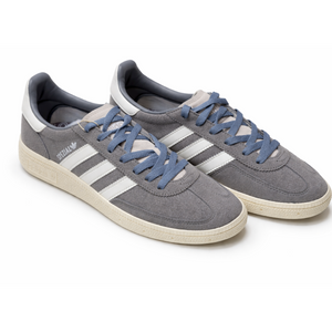 Design: These shoes feature a suede upper, the iconic T-toe design, and serrated 3-Stripes. The specific colorway in the image appears to be grey suede with white stripes and heel tab, accented by blue laces.