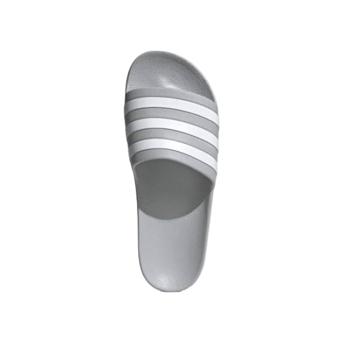 Adidas Adilette Aqua Slides in the color Grey Two with Cloud White stripes. These slides are designed for post-swim comfort and feature a quick-drying material and a soft Cloudfoam footbed for cushioning. The product code for this specific colorway is EG4160 or F35538.