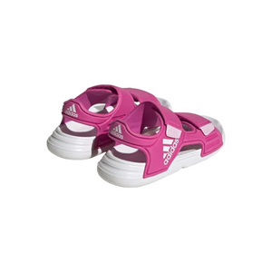 Adidas Altaswim I infants' sandals in Lucid Fuchsia/Cloud White/Clear Pink, product code FZ6505. These sandals are designed for young children and feature adjustable hook-and-loop straps for an easy and secure fit. They have a lightweight EVA upper and a contoured footbed that drains water and dries quickly, making them suitable for the beach or pool.
