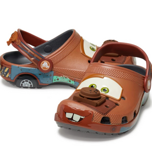 Who’s up for some tractor tippin’? Mater just pulled up to join his best friend, Lightning McQueen, in our collection of Disney and Pixar Cars Classic Clogs. Each pair features Cars’ illustrative graphics unique to Tow Mater. Delight in soft TPU details like an exposed engine on the toe and a tow hook on the heel strap. Ultra-comfy cushioned footbeds will have your feet happier 'n a tornado in a trailer park!