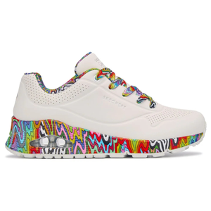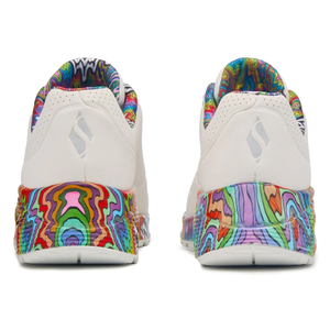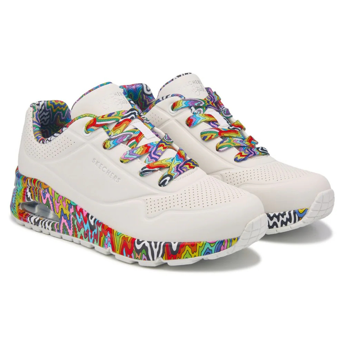 Skechers Street x Jen Stark: Uno - Mini Drip. These shoes are part of a creative collaboration with artist Jen Stark, featuring her signature colorful, "drip" design on the midsole, lining, and laces of the classic Uno silhouette.