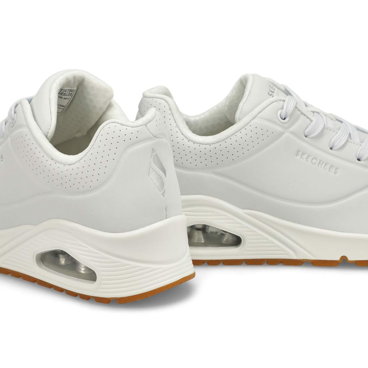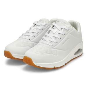 Classic air cushioned style meets updated comfort in the Uno Stand On Air white fashion sneaker from Skechers. Smooth leather-textured synthetic upper in a lace up classic fashion sneaker with stitching and perforation accents. Air Cooled Memory Foam insole, visible air cushioned midsole. Padded collar and tongue for added comfort. Classic style midsole with embossed texture detail.