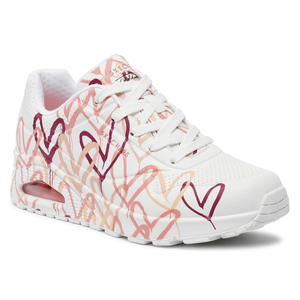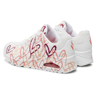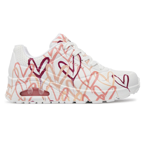 Internationally renowned muralist James Goldcrown brings his iconic #Lovewall heart designs to Skechers in this inspiring collaboration. Show your creative style with the Skechers x JGoldcrown: Skechers Street™ Uno - Spread the Love. This lace-up fashion sneaker features an allover print of the artist's signature heart design that extends to the outsole, synthetic durabuck and perforated trimmed upper with a Skechers Air-Cooled Memory Foam® insole, and a platform wedge with visible Skech-Air® air-cushioned midsole.