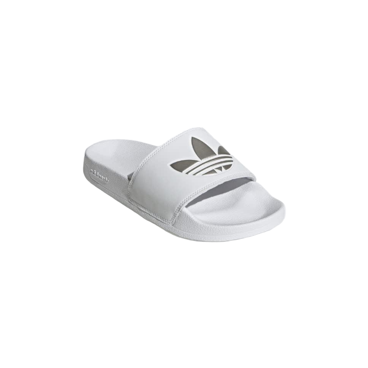 These are lightweight slides designed for comfort and are suitable for casual wear or post-workout relaxation. The slides feature an all-white design with a metallic silver Adidas trefoil logo on the single-bandage upper. The footbed is contoured for comfort, and the slides have a soft feel.