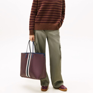 Design: A generously sized tote with two top handles and a main compartment. It is characterized by its central vertical stripes and a signature TH monogram enamel plaque.